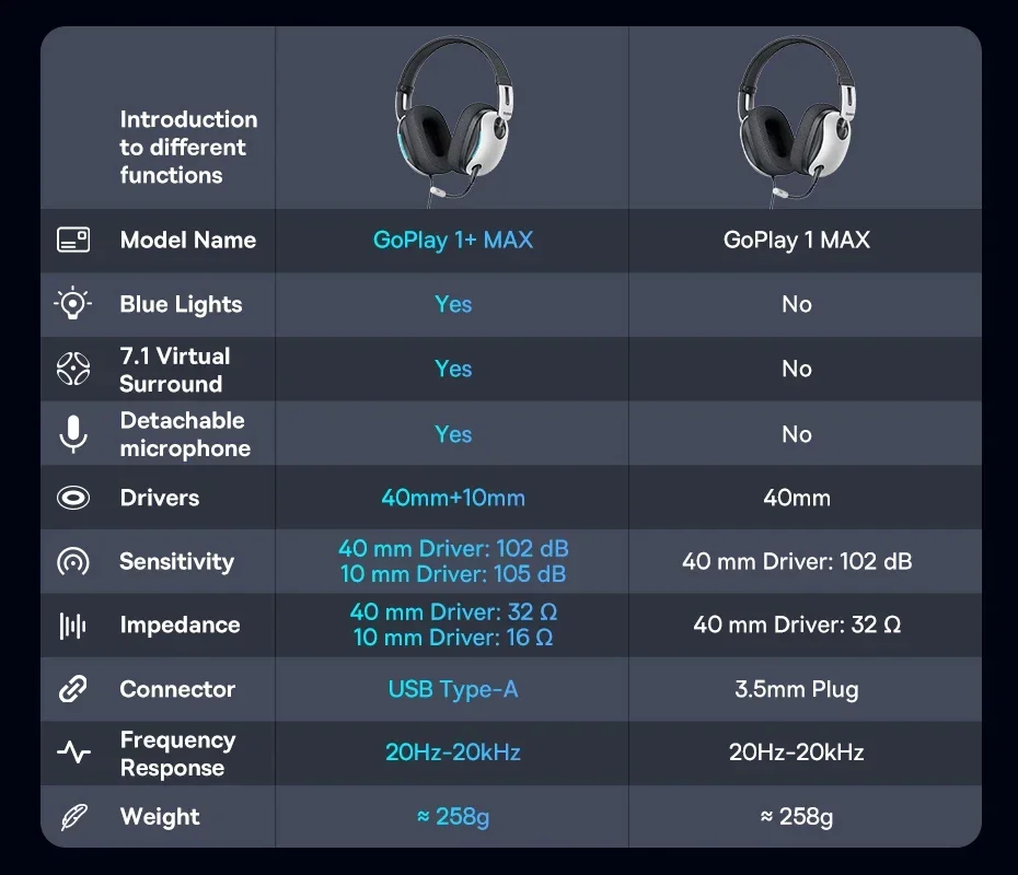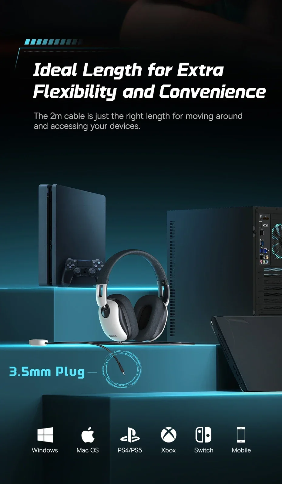 Compatible with Windows, Mac OS, PS4/PS5, Xbox, Switch, and mobile devices, the GoPlay 1+ Max offers flexible connectivity with USB-A or 3.5mm plug options, making it ideal for multi-platform gaming.